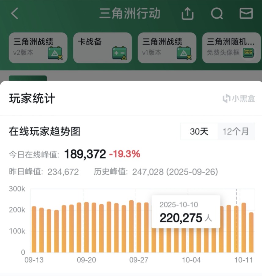 《三角洲行动》10月10日在线玩家峰值。(图源:小黑盒截图)