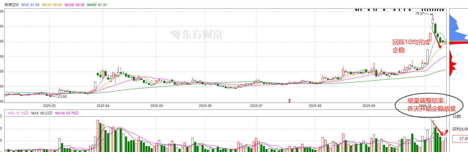 新莱应材300260:新凯莱概念,如图,前面缩量调整完成之后在10均附近完成企稳,而且昨天企稳后开始有量放出,这里也许会反复揉搓一下,也可能像之前的向日葵直接来个板。咬住了就不要松。