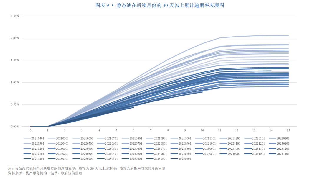 相关评级机构基于微恒科技提供的分付业务历史数据,选取了2021年4月到2024年10月的43个静态池数据,从历史表现来看,2021年4月新增贷款的30天以上累计逾期率最高约为2.00%,2023年以来该数值均不超过1.5%。