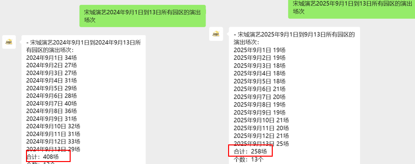 从9月上半周从监控的数据来看,所有园区演出场次同比下降比较严重,具体数据就不算了。