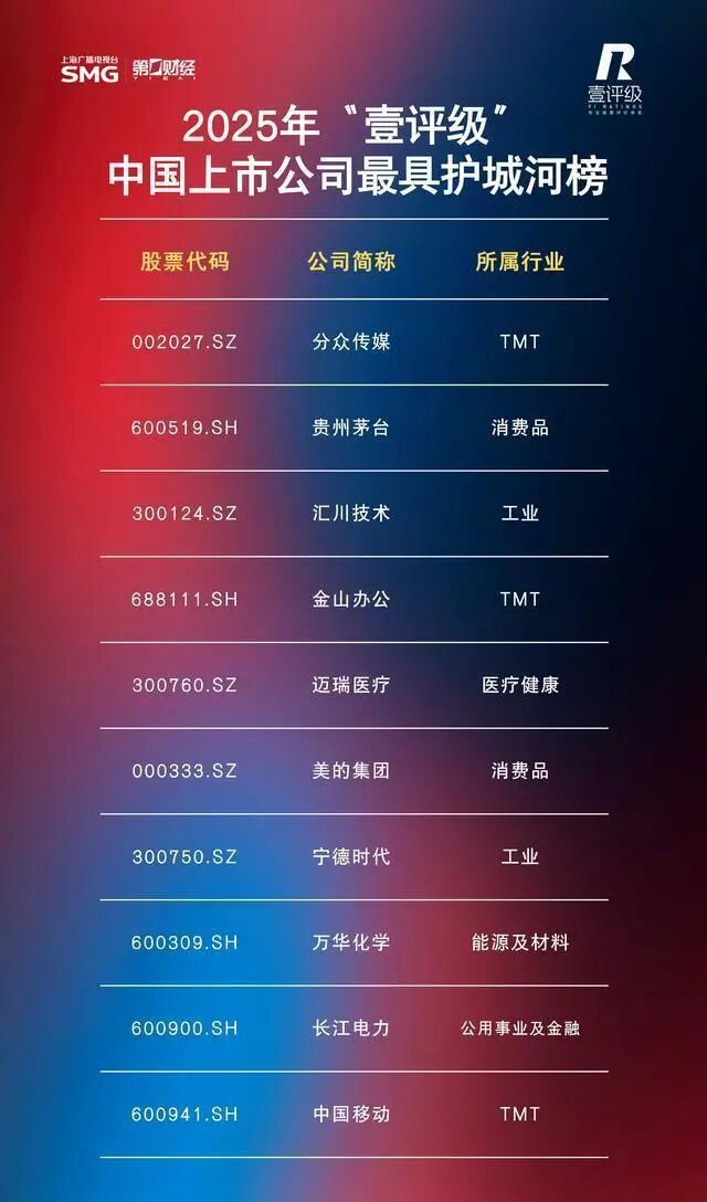 本周在外滩大会见解论坛上,第一财经首次公布了“壹评级”2025年中国上市公司“最具护城河榜”、“最具价值榜”及“隐形冠军榜”三大榜单,并同时发布了首批上市公司深度研究评级报告,其中分众入选了中国上市公司最具护城河榜,这个榜单说白了就是给投资者从定性和定量的角度分析企业的优劣势,让大家知道哪些企业至少在未来5年内,在资源,品牌以及规模等优势都能保持比较好的竞争力,同时把竞争对手隔离在门外,自己可以赚得更久、赚得更多。