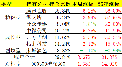 今年整体账户盈利31.37%,其中稳健型占比50%,成长型占比36%,困境型占比3%和现金占比11%,看了一下25年个股的涨幅,基本是符合预期,其中涨幅最差的宋城演艺在去年跟踪其演出场次逐渐下跌,以及Q3业绩不及个人预期后,在10元左右卖出了绝大部分,宋城也被我归类到困境型的观察仓,现在隔了一年回头看,自己当初的判断还是正确的,可见持续跟踪的必要性。