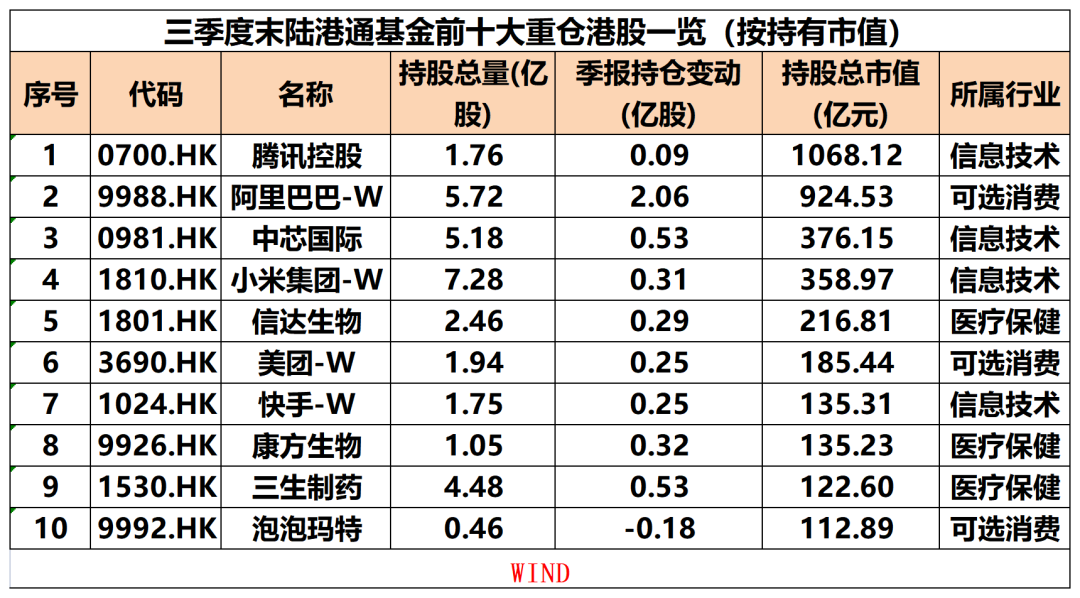 按照持有市值统计,截至三季度末,被陆港通基金重仓的前十大港股分别为腾讯控股、阿里巴巴-W、中芯国际、小米集团-W、信达生物、美团-W、快手-W、康方生物、三生制药、泡泡玛特,涵盖可选消费、信息技术、医疗保健等领域。其中,仅泡泡玛特遭陆港通基金减持。