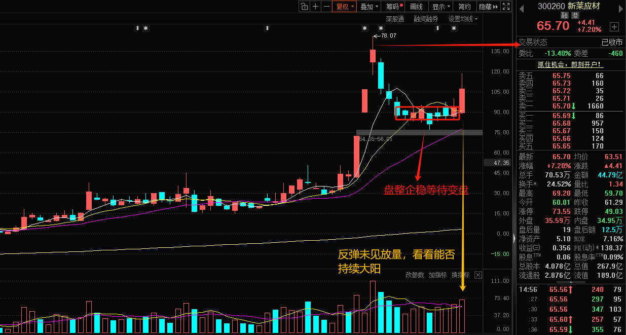 新莱应材300260:新凯莱概念,昨天虽说已经开始反弹了,但是从量能来看,并没有完全发力,倒像是控潘度比较高的情况,那么今天就可能再度出现中阳甚至大阳,接近前高的位置就考虑撤退,或者冲高撤也行。