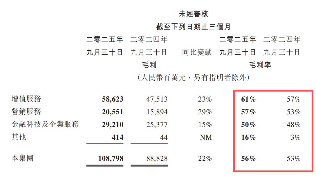腾讯增值服务业务毛利同比增长23%至人民币586亿元,主要受益于若干自研高毛利率