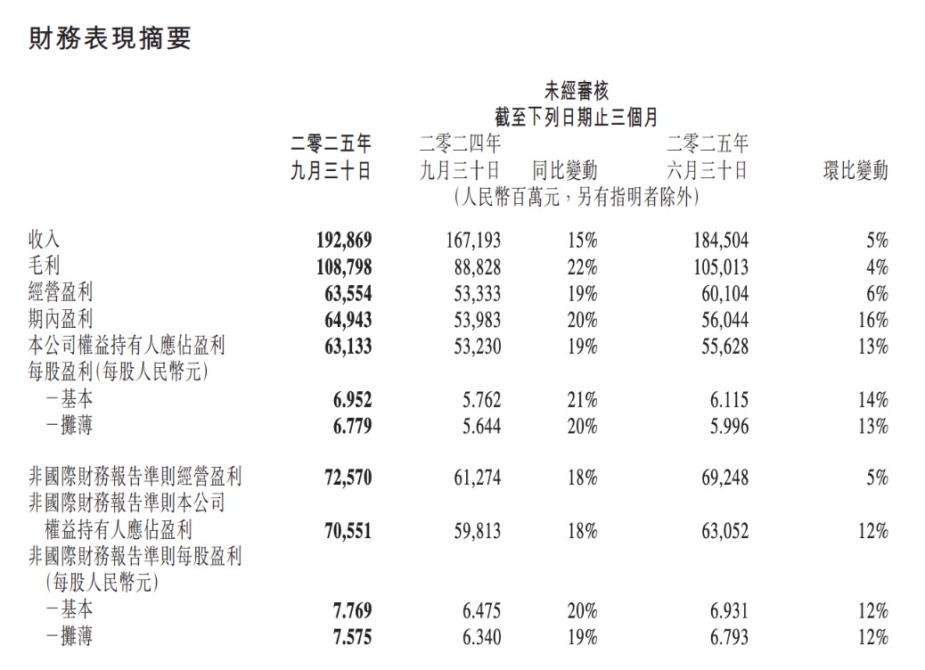金融科技及企业服务业务在第三季度收入582亿元,同比增长10%,相比上述两大业务增幅较小。金融科技服务收入受益于商业支付活动及消费贷款服务的增加;企业服务收入则因企业客户对AI相关云服务需求上升以及微信小店交易额扩大带动的商家技术服务费增长,同比增长十几个百分点。