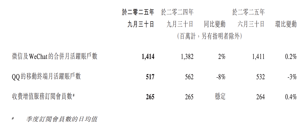 而在关键应用的用户数据方面,微信及WeChat的合并月活跃账户数达14.14亿,同比微增2%;QQ的移动终端月活跃账户数为5.17亿,同比下降8%。收费增值服务订阅会员数稳定在2.65亿。