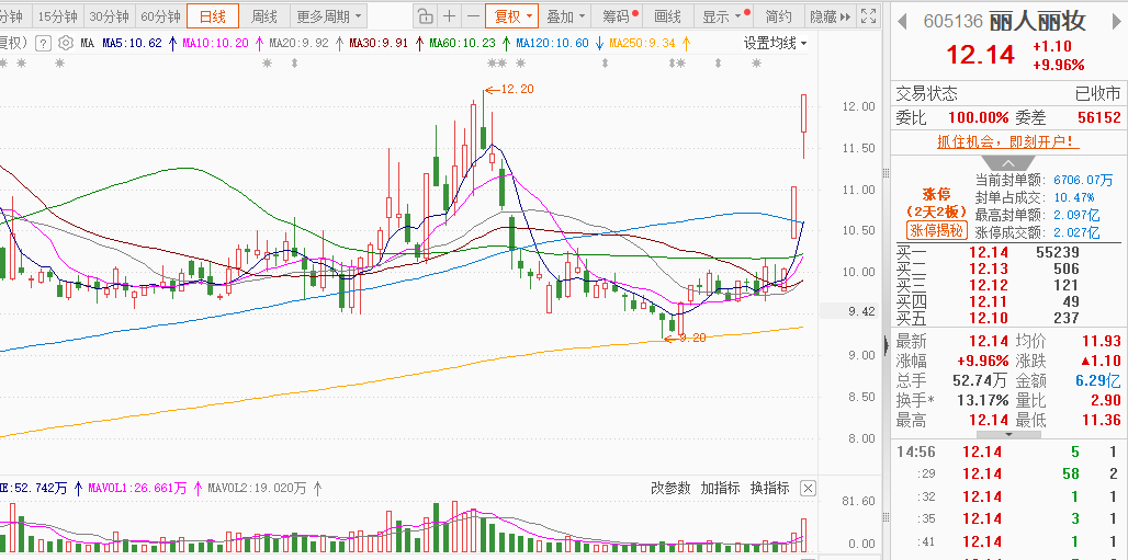 丽人丽妆:化妆+电子商务,该股周二涨停股价突破筑底区间,向上走加速拉升,均线向上粘合发散,走多头趋势,今天跳空高开形成突破性缺口,但跳空高开幅度太大,所以没抓,想着回踩在考虑的,但直接涨幅一直在5%左右所以放弃了,但从封单和连板力量以及时间看,拉升力量还有持续性,而且位置不算高,看周四能否继续冲锋。