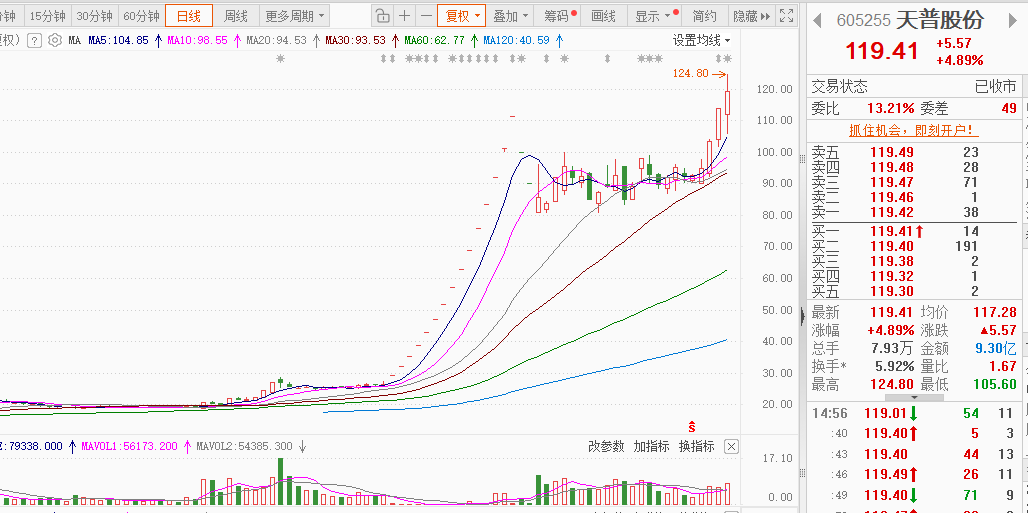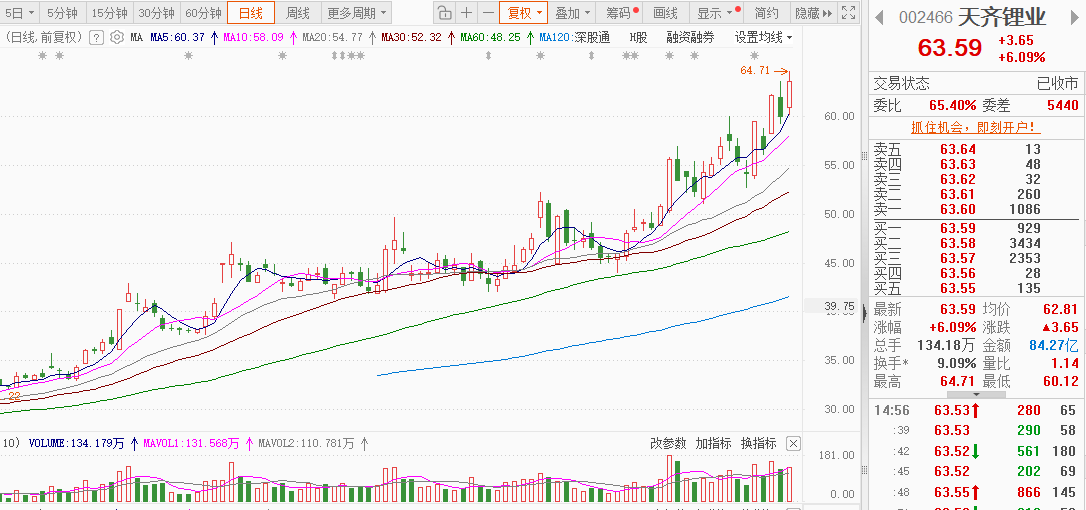 天齐锂业:锂电池,趋势妖股,该股是我们周二早盘看好标的,也强调过趋势还在,一直走主升浪上涨,沿着5均线和10均线走震荡拉升,虽然周二股价被市场拖累回撤,但没有跌破均线趋势支撑,且趋势依然向上运行没有翻转,今天支撑上移,股价企稳后开始有拉升迹象,所以早盘看到5均线企稳低息了点。
