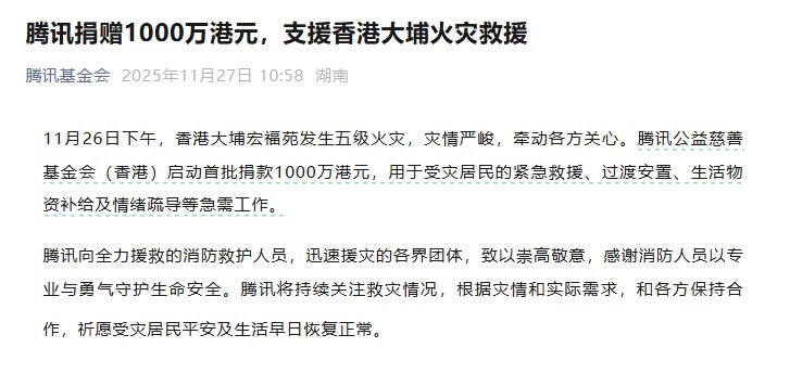 腾讯、阿里、蚂蚁、小米、字节跳动等共捐款6000万港元,支援香港火灾救援