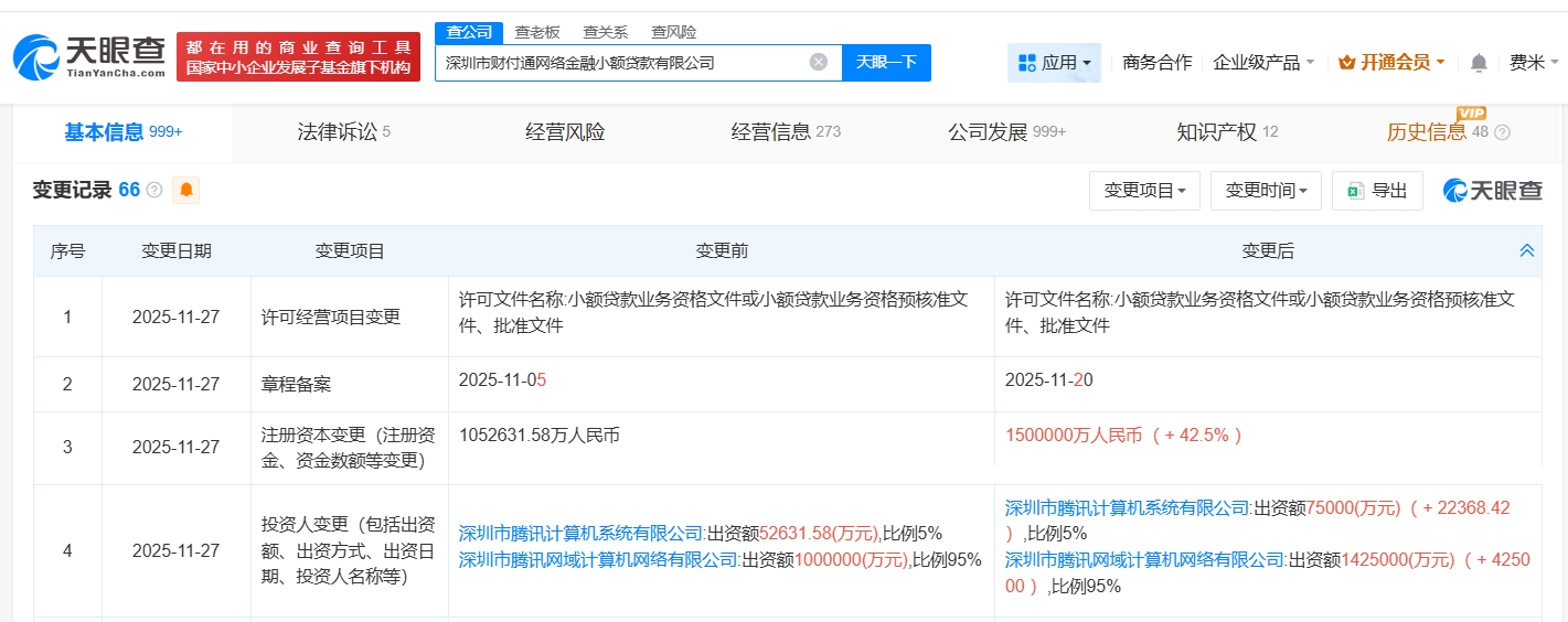 天眼查工商信息显示,近日,财付通小贷关联公司深圳市财付通网络金融小额贷款有限公司发生工商变更,注册资本由约105.3亿人民币增至150亿人民币,增幅42.5%。该公司成立于2013年10月,法定代表人为杜西库,经营范围为专营小额贷款业务,经相关部门批准开展互联网小额贷款业务,由深圳市腾讯网域计算机网络有限公司、深圳市腾讯计算机系统有限公司共同持股。