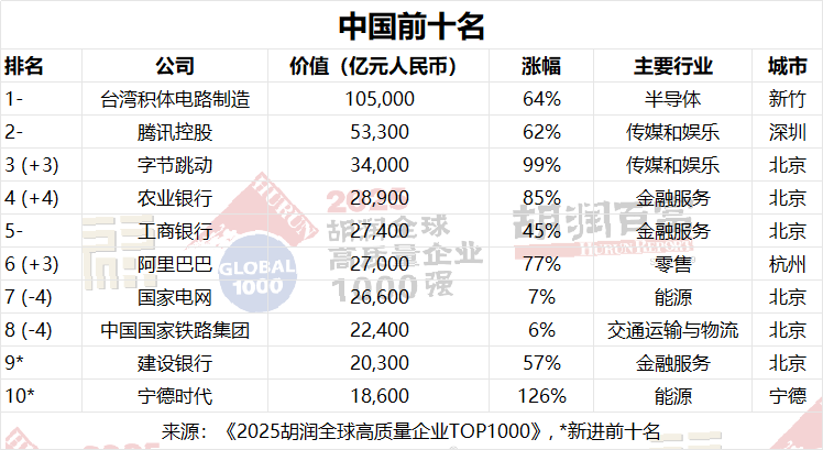 从企业结构看,中国上榜企业中,国有企业达83家,非国有企业75家,两者数量趋于均衡。其中,台积电(TSM.N)与腾讯控股(00700.HK)成为价值增长最快的中国企业,字节跳动、农业银行(601288.SH)和阿里巴巴(09988.HK)等紧随其后。这些企业的共同特点是在人工智能、云计算、新能源等新兴领域的布局深化,推动了其市值与创新能力的双重跃升。