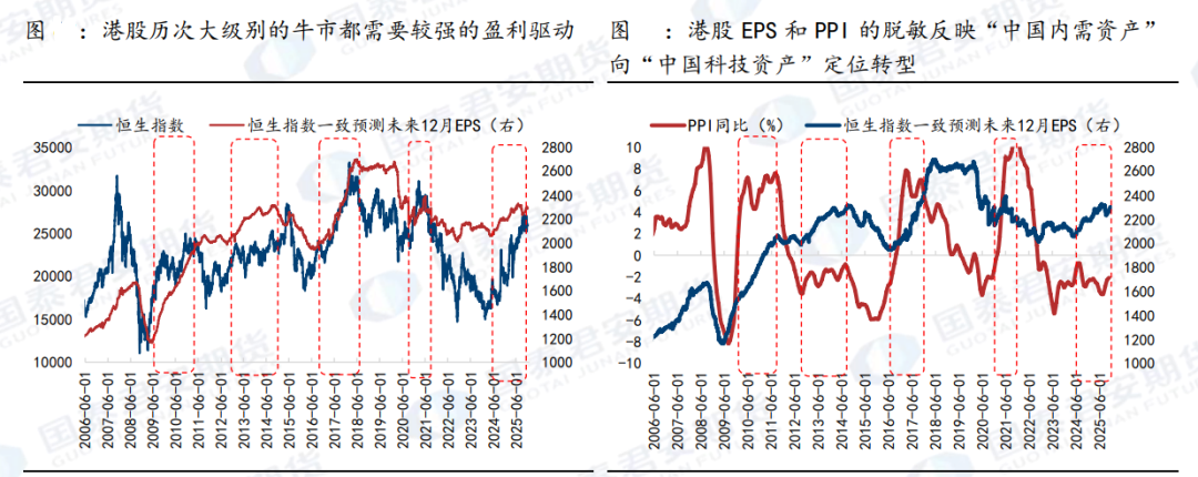 2026 年,国内债务收缩期的核心矛盾下,类似于 2025 年 K 型分化的经济结构可能延续:传统内需行业承压,出口拖底,新兴行业突围,而 K 型分化的趋势能否收敛取决于后续增量政策的力度和节奏(当前能见度仍然不高,需持续跟踪)。我们判断,2026 年传统内需行业“赔率合意但胜率能见度不高”的格局仍将延续,“赔率性价比收敛但高胜率”的科技+反内卷板块将主要贡献盈利增量:(1)科技产业创造的新质增长点:“中国内需资产”向“中国科技资产”战略转型,近年来港股 EPS 和 PPI 的脱敏反映科技产业趋势可以一定程度超越宏观周期。“十五五”定调自主可控和国产替代将会是下一阶段的政策重点,产业趋势已逐步明朗的港股 AI/创新药等科技资产 2026 年对于港股的盈利贡献将进一步凸显;(2)反内卷政策出台有助于改善企业盈利预期:随着反内卷政策的深入推进+基数偏低,相关行业价格实现逐步改善,展望 2026 年,尤其是“供给侧出清”叠加 “需求侧改善”的部分环节(例如:储能)盈利贡献将进一步凸显。
