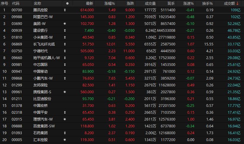 盘面上,大型科技股集体上涨,腾讯、快手、网易、美团、百度均涨超1%;医药类股集体活跃,药明系个股皆上涨;机构指板块有望迎来进一步价值重估,濠赌股午后涨幅持续扩大,美高梅中国涨6.6%领衔;AI持续拉动光纤光缆需求,长飞光纤光缆大涨12%带动光通讯板块上涨;汽车股、风电股、教育股、光伏股、保险股、苹果概念股齐涨。另一方面,重型机械股部分下跌,中国重汽跌超6%;黄金股、体育用品股、港口及海运股、石油股部分低迷。