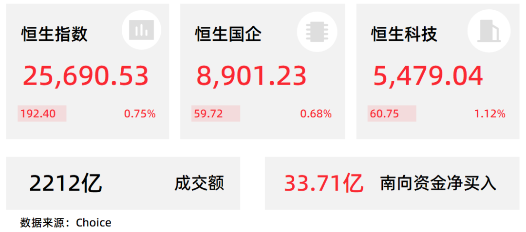 12月19日,美国CPI年率回落隔夜美股拉升,带动风险市场情绪回温。港股三大指数今日高开高走,恒生指数尾盘一度涨至1%,最终收涨0.75%,国企指数、恒生科技指数分别上涨0.68%及1.12%。