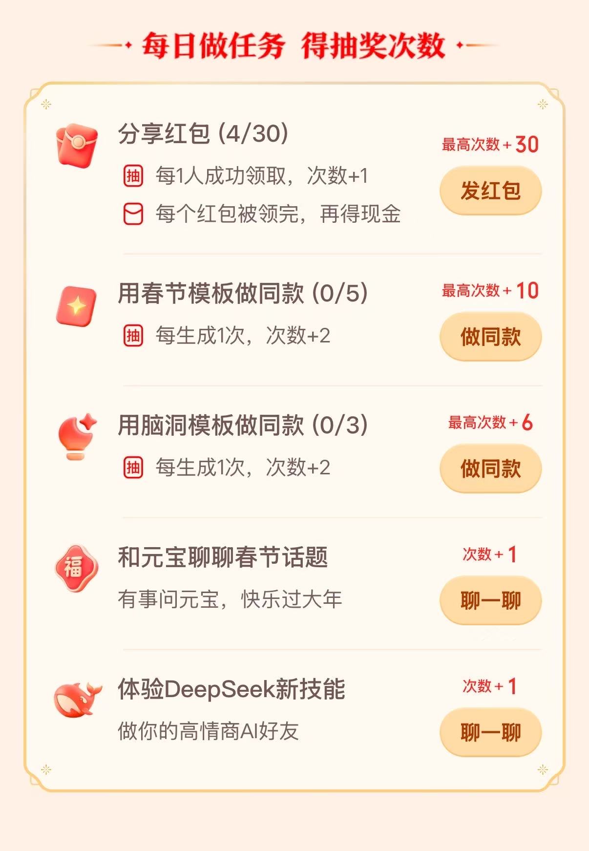 从此次腾讯红包的设计来看,除了红包分享获得抽奖次数以外,用元宝做春节同款新春贺卡、和元宝聊春节话题,体验DeepSeek新技能也能获得一定的抽奖次数。