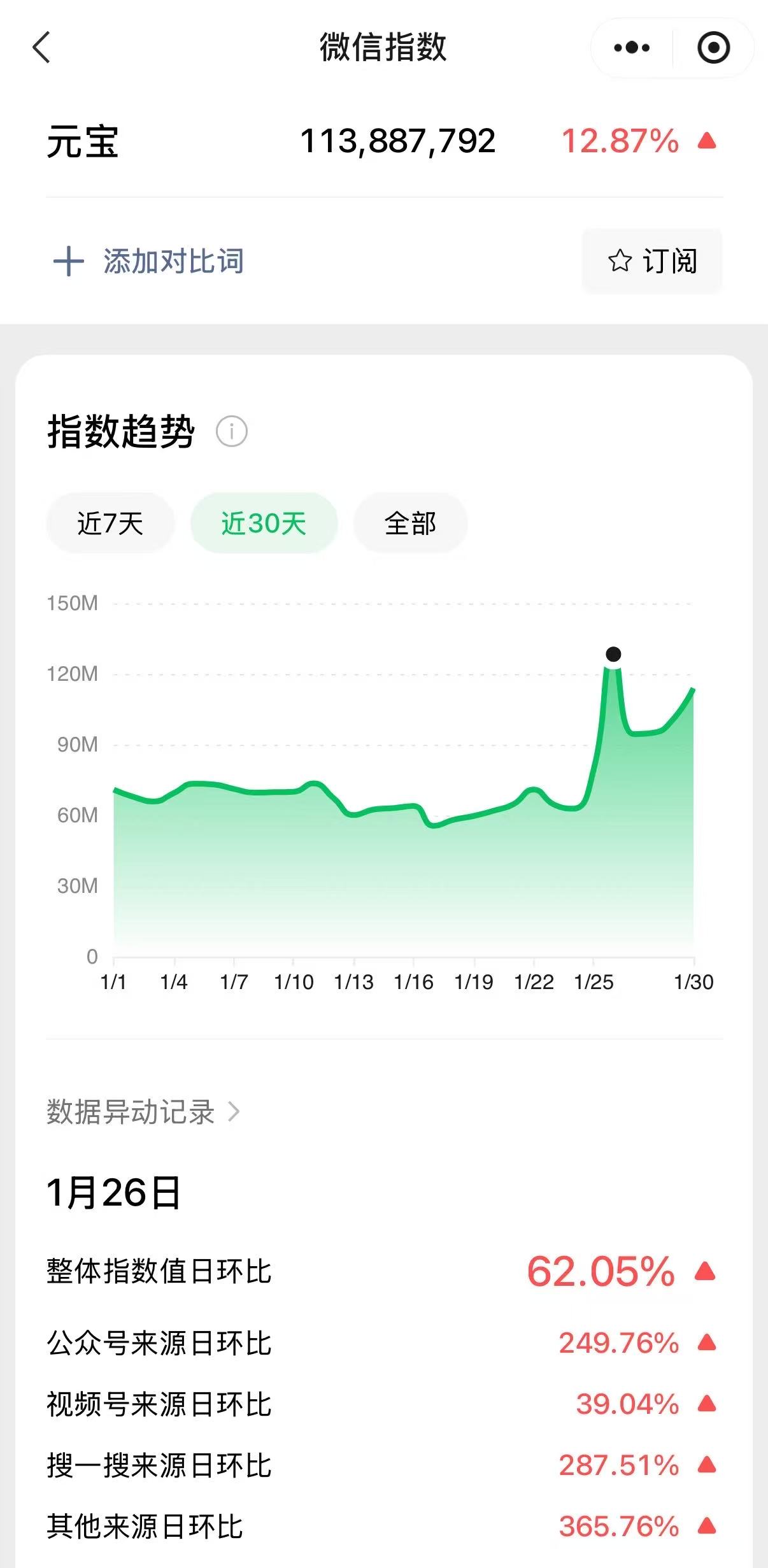 从数据来看,腾讯此轮红包大战吸引力颇强。从微信指数来看,2026年1月25日,腾讯宣布将通过元宝开启10亿元红包活动之后,1月26日“元宝”在微信的指数值就突然飙升到超过1.2亿,整体指数值日环比增长62.05%。之后的一周时间略有回落,但依然显示高于腾讯宣布红包活动之前。