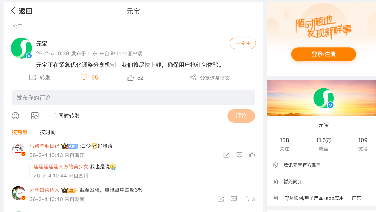 记者注意到,随后,腾讯元宝在微博中表示:“元宝正在紧急优化调整分享机制,我们将尽快上线,确保用户抢红包体验。 ”