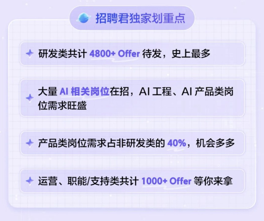 本次招聘重点倾斜研发、产品与AI领域。其中研发类岗位Offer数量超4800个,史上最多。