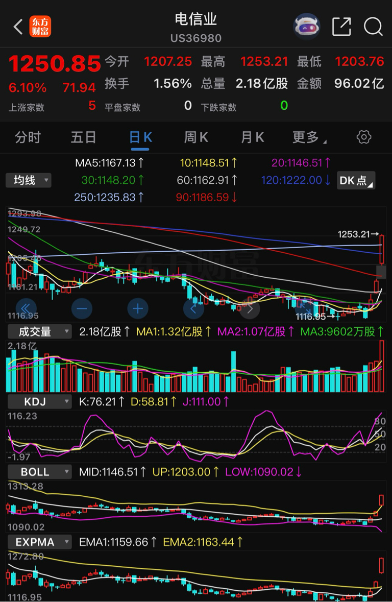 美股纳指连续三天下跌,电信业板块逆市触底反弹,幅度越拉越大,关注国内同行业三大电