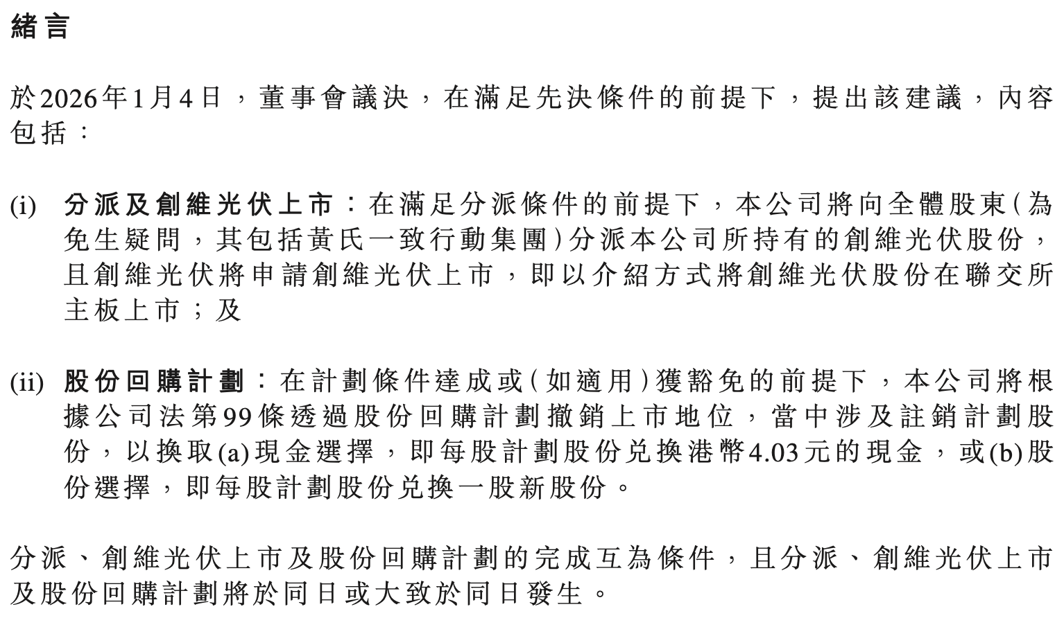 1月20日晚,创维集团(00751.HK)发布公告,公司董事会于2026年1月4日决议,将分拆创维光伏,并申请以介绍方式在联交所主板上市。