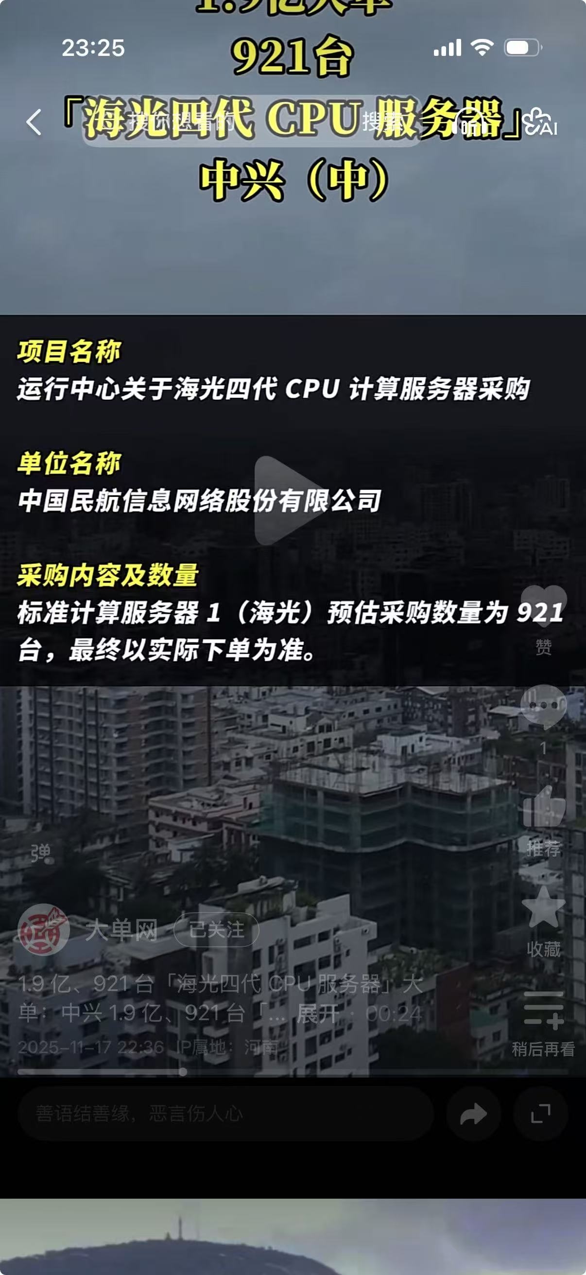 $中兴通讯(HK|00763)$ 今日公示中标1.9亿cpu服务器