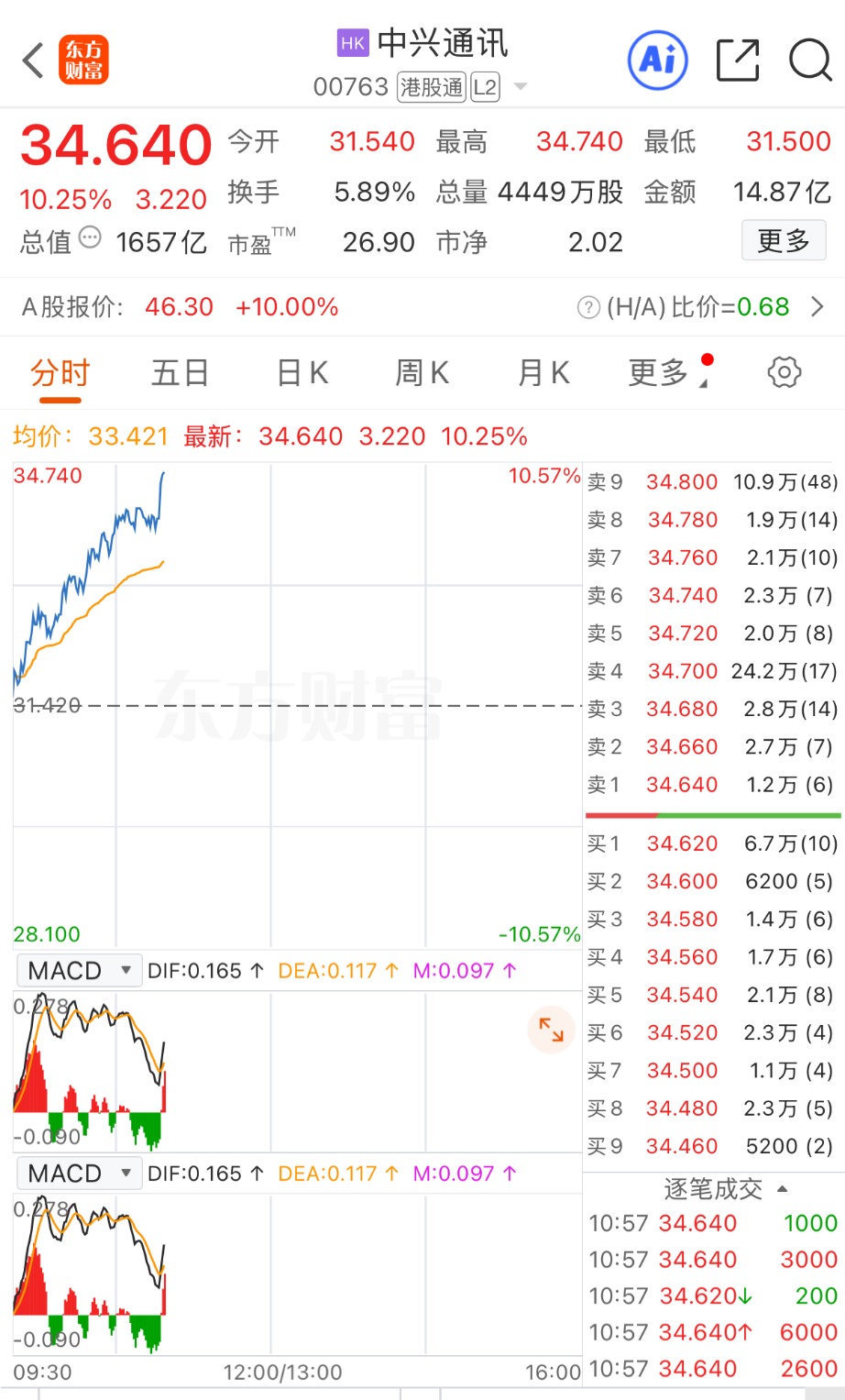 上证报中国证券网讯(记者何治民)12月1日,中兴通讯H股高开高走,一度涨超10%,截至10时57分,股价涨10.25%,股价报34.64港元/股;与此同时,中兴通讯A股涨停,报46.30元/股。