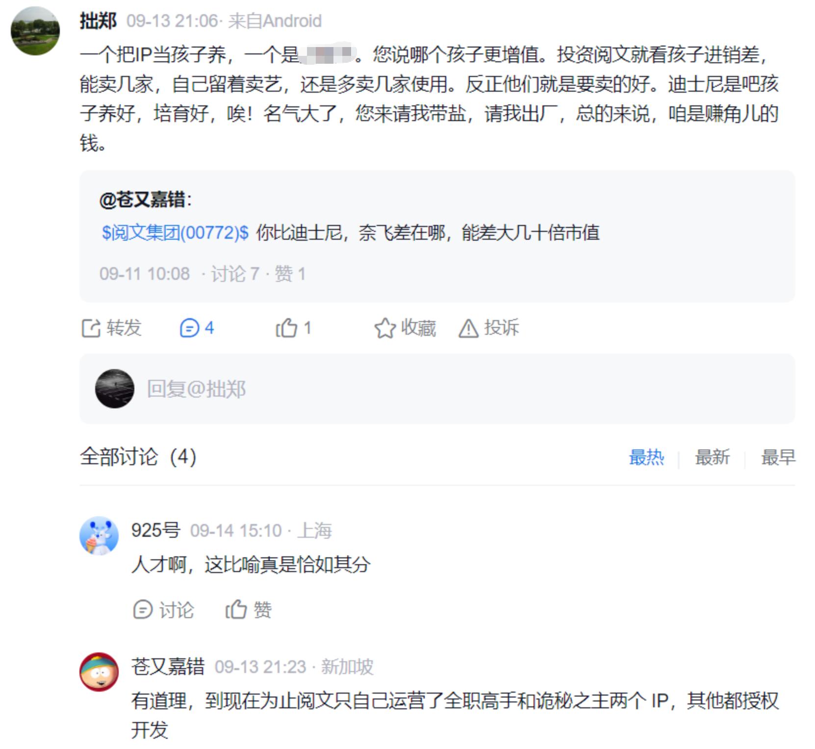 针对阅文目前IP衍生品的运营,值接Talk在雪球上看到了一个网友的比喻。