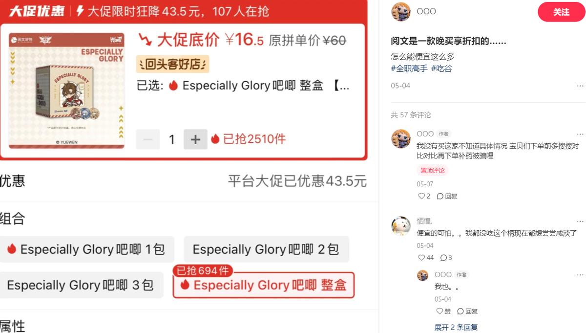 譬如阅文的谷子在谷圈是出了名的“早买早后悔,降价堪称IP衍生品最要命的“背刺”行为,而这种情况在阅文的部分产品上时常发生。