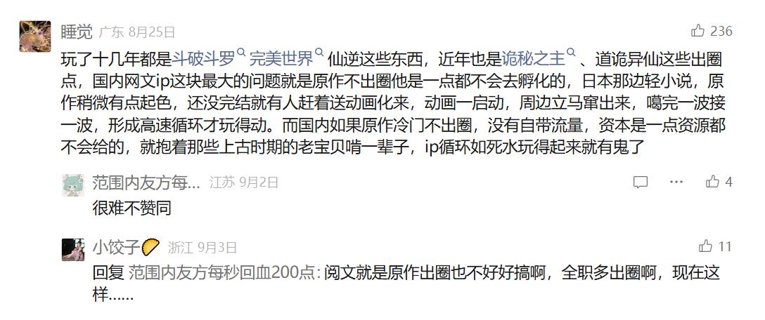 正如网友称,国内网文IP[这块最大的问题就是,原作不出圈他是一点都不会去孵化的,日本那边轻小说,原作稍微有点起色,还没完结就有人赶着送动画化来,动画一启动,周边立马窜出来,噶完一波接一波,形成高速循环才玩得动。