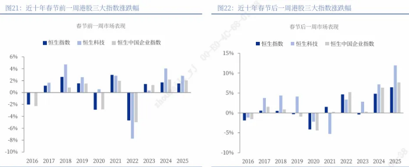 回顾近十年港股市场春节前后的表现,结果显示:春节前一周,恒生指数、恒生科技指数、恒生中国企业指数上涨的概率分别为70%、90%、70%;春节后一周,恒生指数、恒生科技指数、恒生中国企业指数上涨的概率分别为60%、70%、70%。港股市场春节效应明显,主要因市场情绪偏向乐观,资金提早布局。