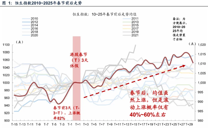 节前3个交易日恒指上涨概率82%。基于2010至2025年恒生指数春节窗口的历史表现,节前最后三个交易日(T-3至T区间),指数上行概率为82%,均值在该阶段表现为斜率更陡且方向一致的抬升,反映出节前资金行为更趋同、短期做多一致性更强。