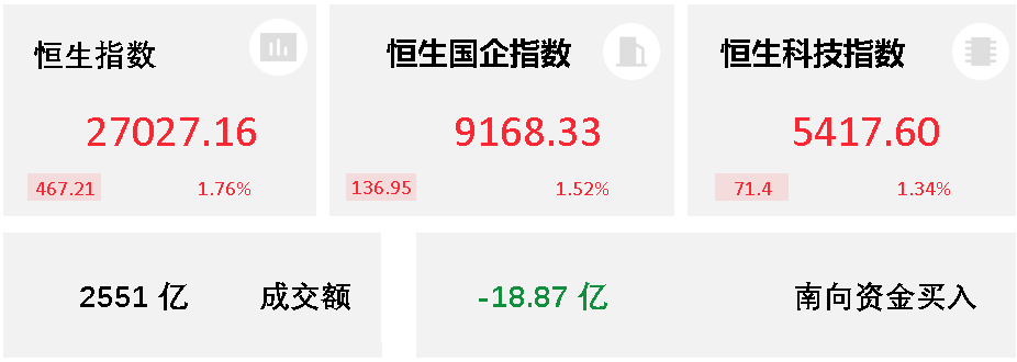 2月9日,港股三大指数集体上涨,恒生指数涨1.76%重回27000点上方,国企指数、恒生科技指数分别上涨1.52%及1.34%,市场情绪转好。