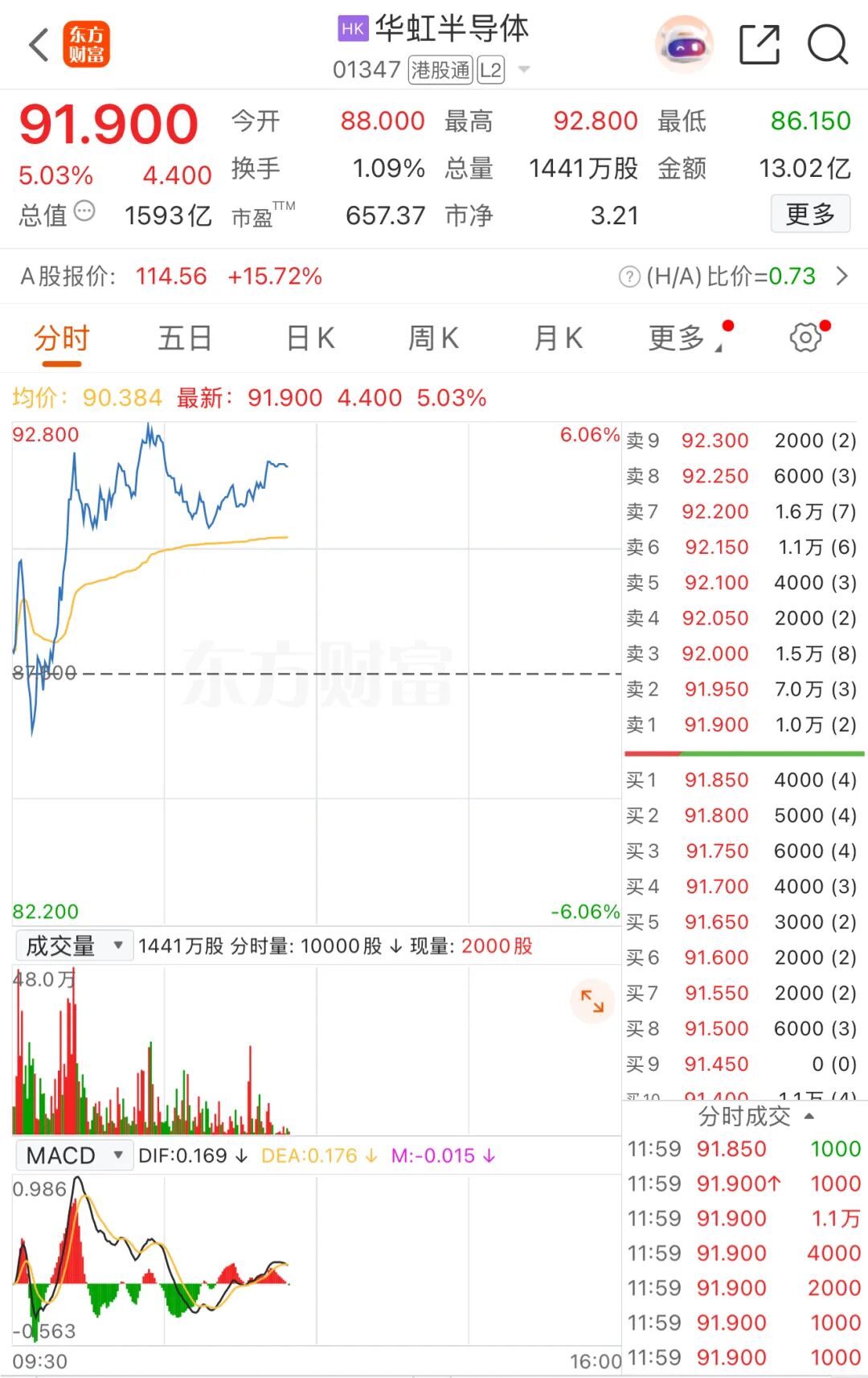 10月6日,港股华虹半导体盘中涨超6%,再创历史新高。截至午间收盘,华虹半导体涨5.03%,报91.90港元/股,成交额超过13亿港元。自9月5日以来,21个交易日,华虹半导体港股股价涨幅为99.54%。