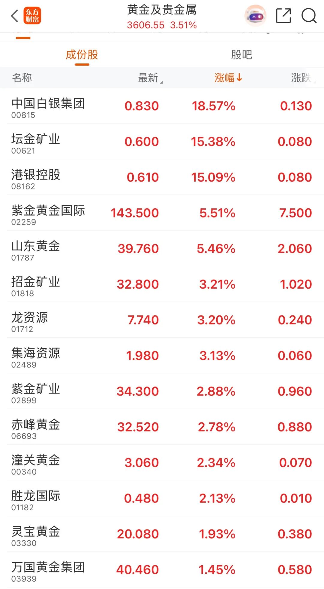 10月6日,港股黄金及贵金属板块走强。截至午间收盘,中国白银集团涨超18%,港银控股涨超15%,山东黄金涨超5%,紫金黄金国际涨超5%,潼关黄金涨超2%,招金矿业涨超3%。