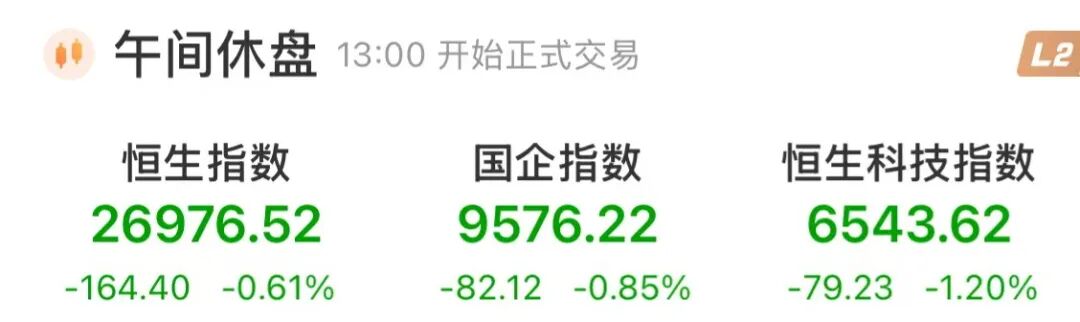 10月6日,港股市场低开低走。截至午间收盘,恒生指数跌0.61%报26976.52点,恒生国企指数跌0.85%报9576.22点,恒生科技指数跌1.20%报6543.62点。