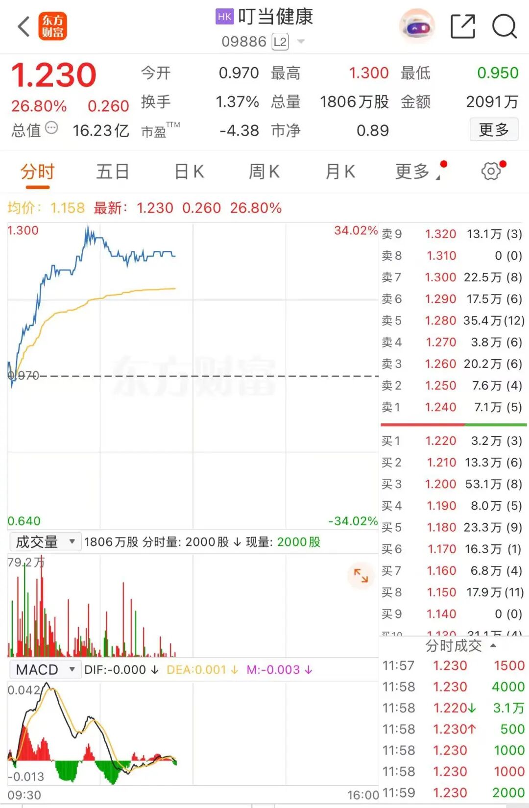 今日早盘,叮当健康盘中飙升34%,截至午间收盘,涨26.8%,报1.23港元/股。