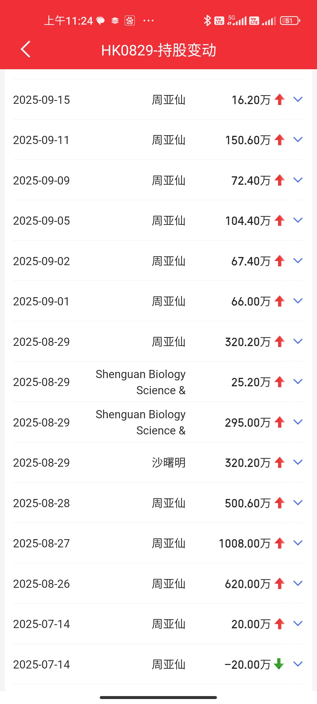 $神冠控股(HK|00829)$ 看样子周亚仙今年一直在收货