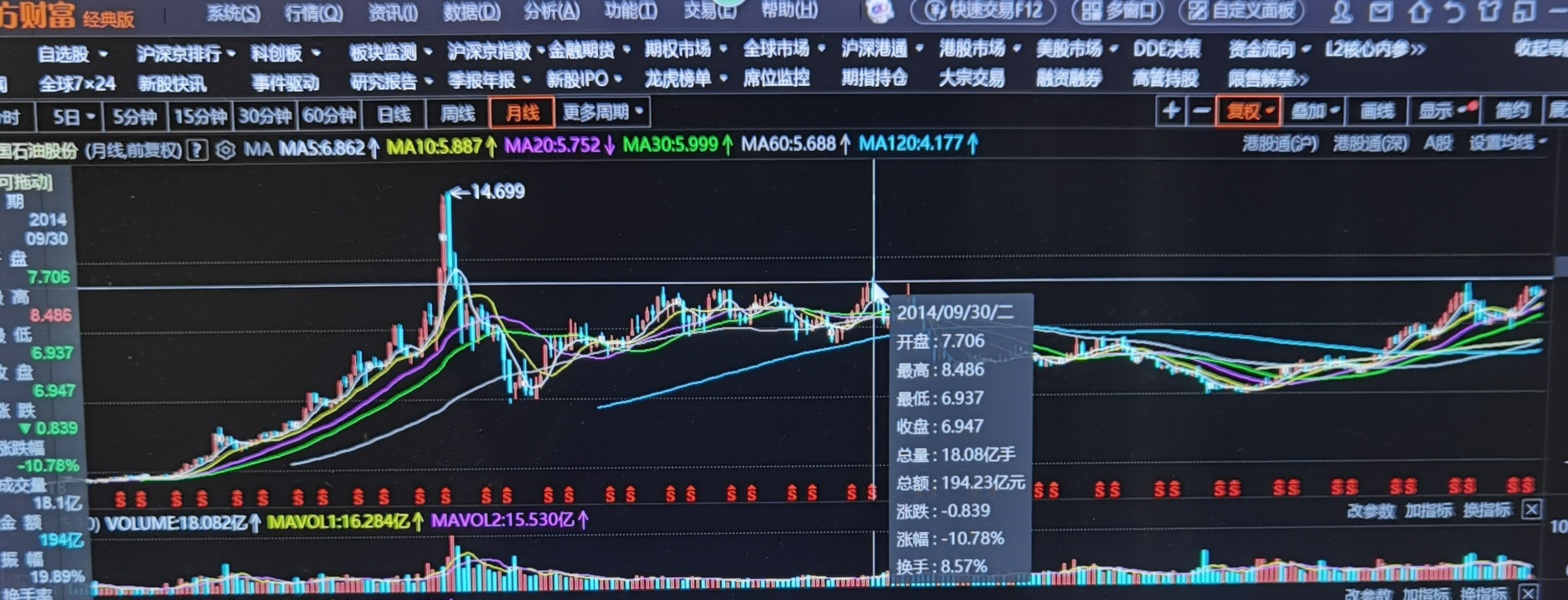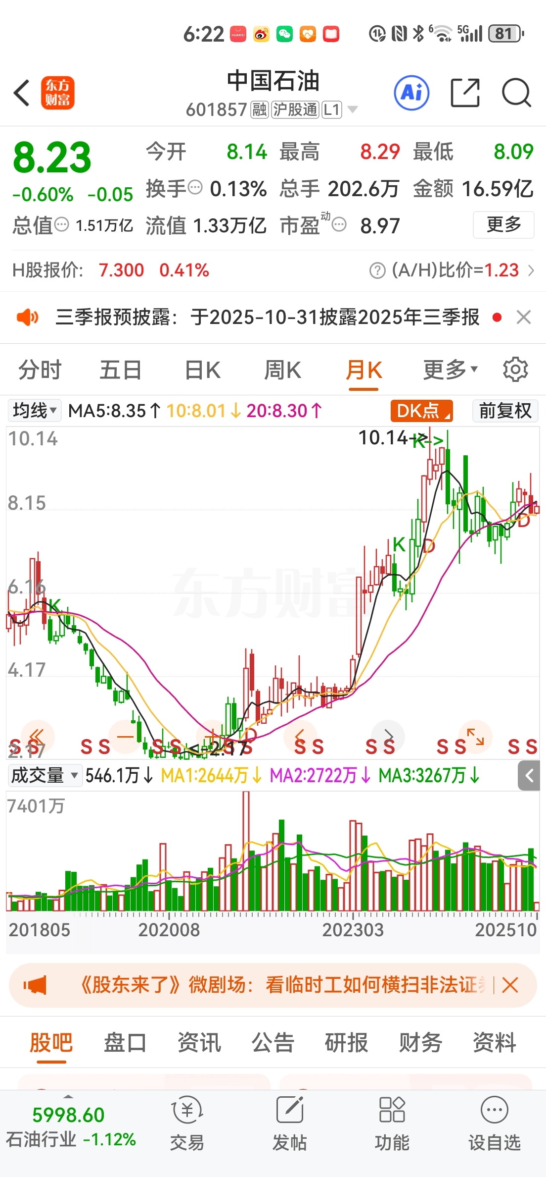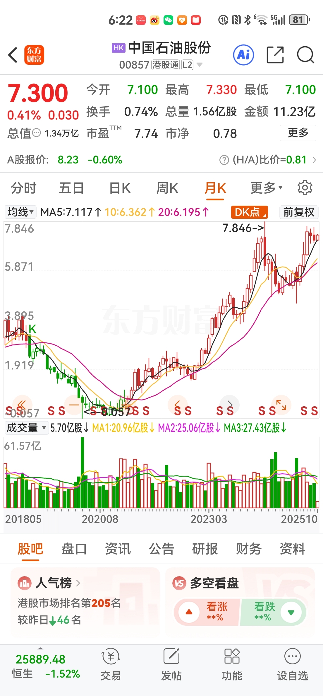 $中国石油股份(HK|00857)$ 三桶油六只股,中石油H一枝独秀。3分秀肌肉。第一目标:突破7.846(不复权8.60)。第二目标:超过中石油A。第三目标:真正超过中石油A(倒溢价)。第四目标:突破8.486。第五目标:当然是突破14.699,创历史新高。创历史新高之后啊?那,天空才是顶了(营收10万亿,利润1万亿)。