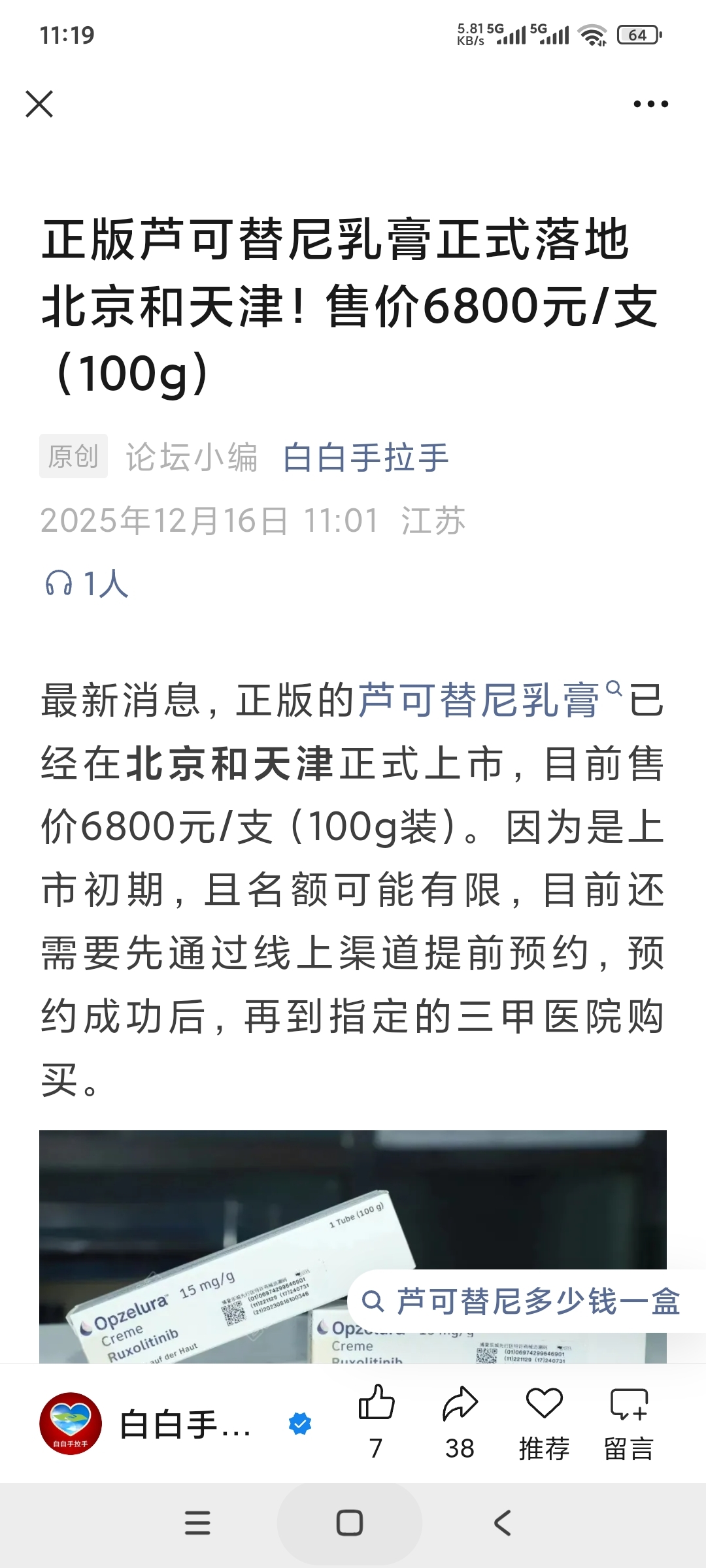 $康哲药业(HK|00867)$ 正版的芦可替尼乳膏已经在北京和天津部分三甲医院正式销售