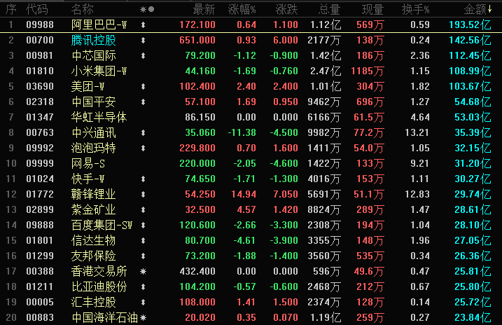 盘面上,大型科技股走势明显分化,铜业股、黄金股领衔有色金属股上涨,锂电池板块全天表现强势,赣锋锂业业绩超预期大涨近15%领衔;煤炭股、港口及海运股、光伏股、核电股、家电股、建材水泥股多数活跃。内房股集体弱势,苹果概念股、体育用品股、啤酒股、餐饮股等消费类股多数低迷。