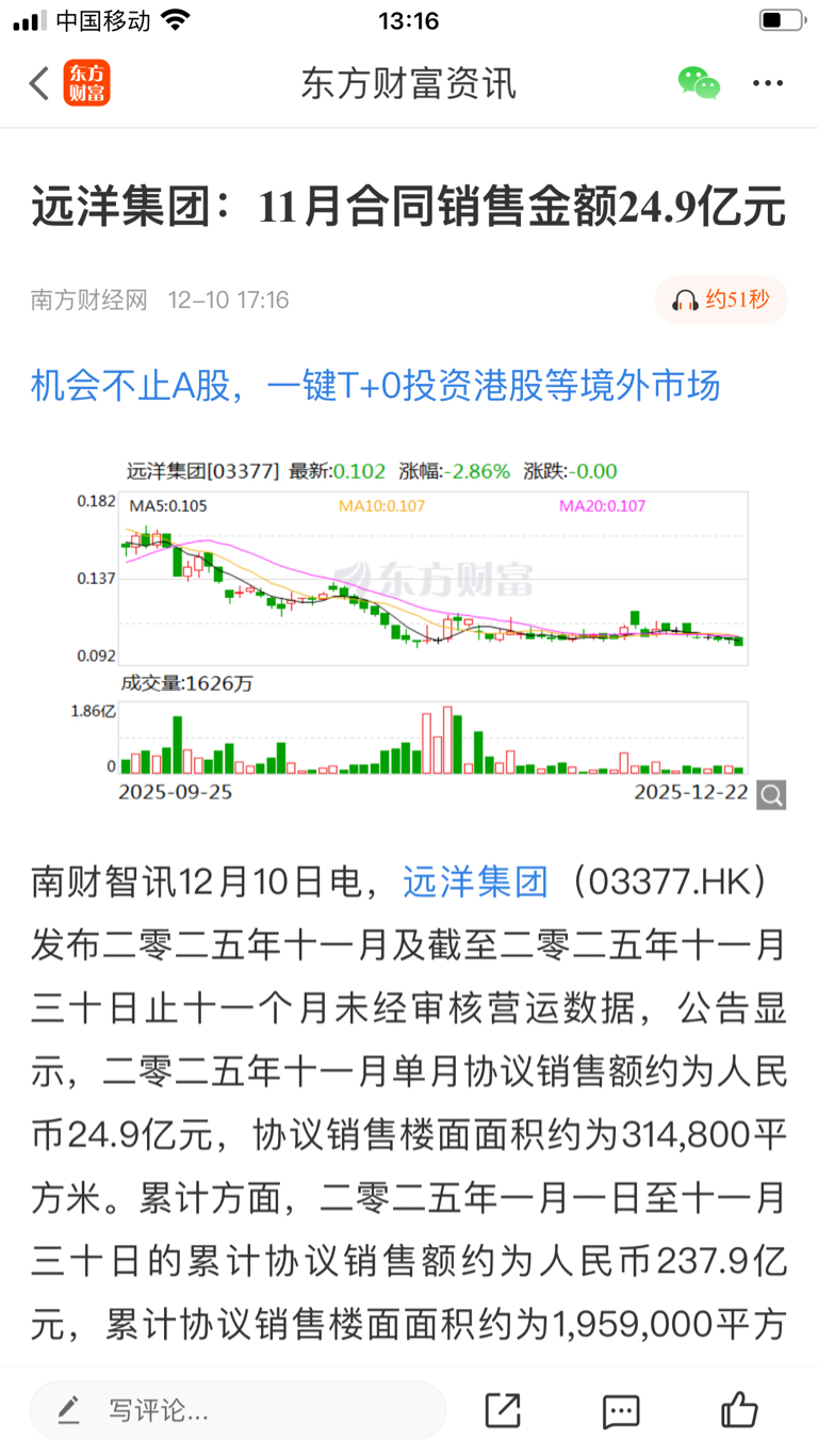 这股每股亏8毛,远洋集团每股亏2毛,跌到1毛,所以这相应的股价应该在3分左右。远洋集团还有央企的身影,而且远洋11月的销售额24.9亿,而这个销售额才只有区区5亿多。远洋集团优势还多的多。