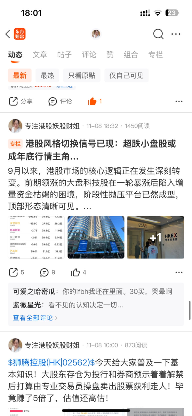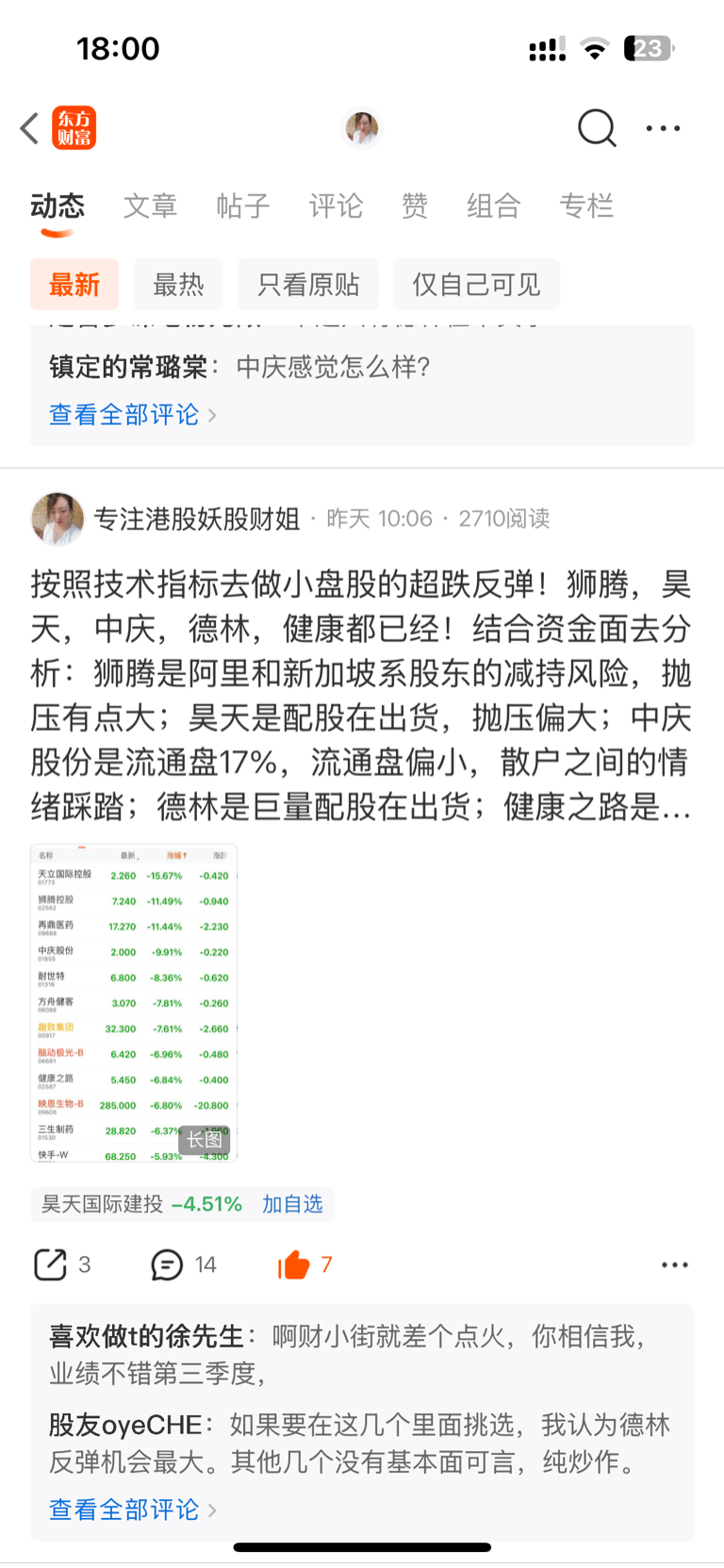 周末大家情绪极度悲观的时候,财姐预测这周小盘股将迎来报复性的反弹,资金在高切低,布局超跌小盘股,今天提前布局的粉丝们都吃大肉了吧!继续和财姐一起布局超跌小盘股!短线情绪修复将会出现翻倍妖股!$沪上阿姨(HK|02589)$ $香港中旅(HK|00308)$ $阿里巴巴-W(HK|09988)$