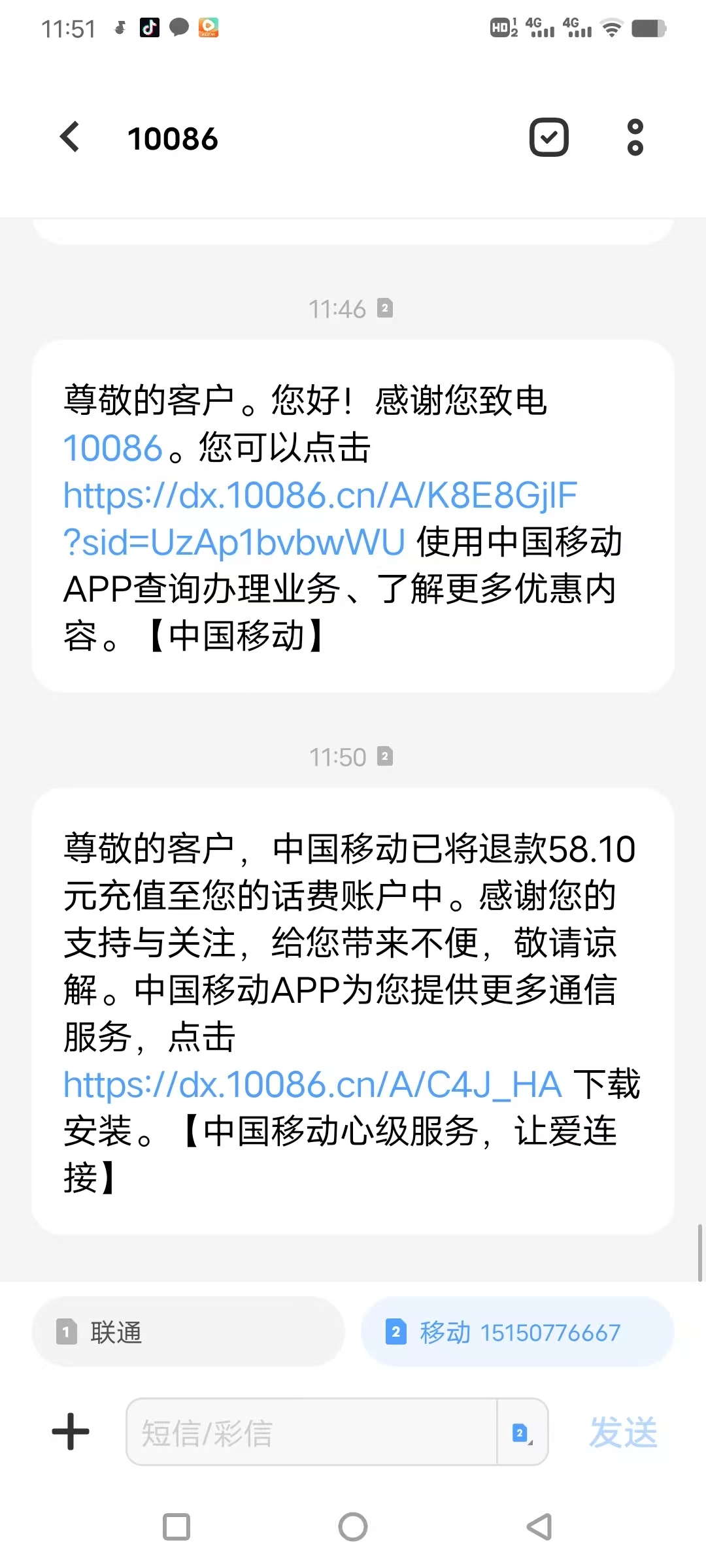 $中国移动(HK|00941)$ 中午打10080直接全部退我了,58.1