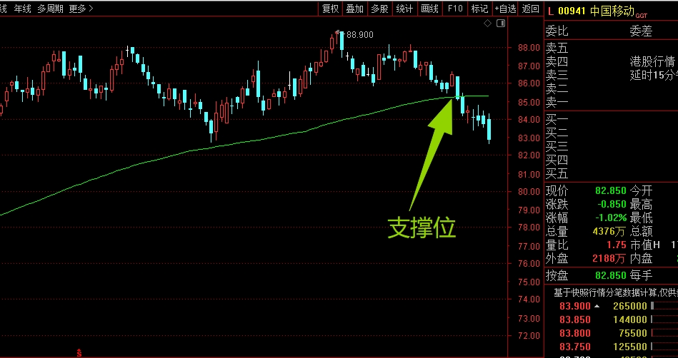 $中国移动(HK|00941)$ 中期趋势没问题,一直都是震荡上行的趋势,但短期这里跌破了大均线85.283位置的支撑,略显得偏弱了,这里需要控制仓位应对,以免继续震荡回落的风险,等后期拉起来站稳大均线后再考虑回补仓位也不迟。#炒股日记# #收盘点评#