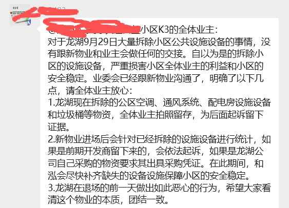 $龙湖集团(HK|00960)$ 龙湖物业挺牛 被小区业主选走了 然后交接的时候直接把 垃圾桶 花园栅栏 小区空调 通风设备系统 配电房设施 通通拆除 不知道物权法是怎么规定的