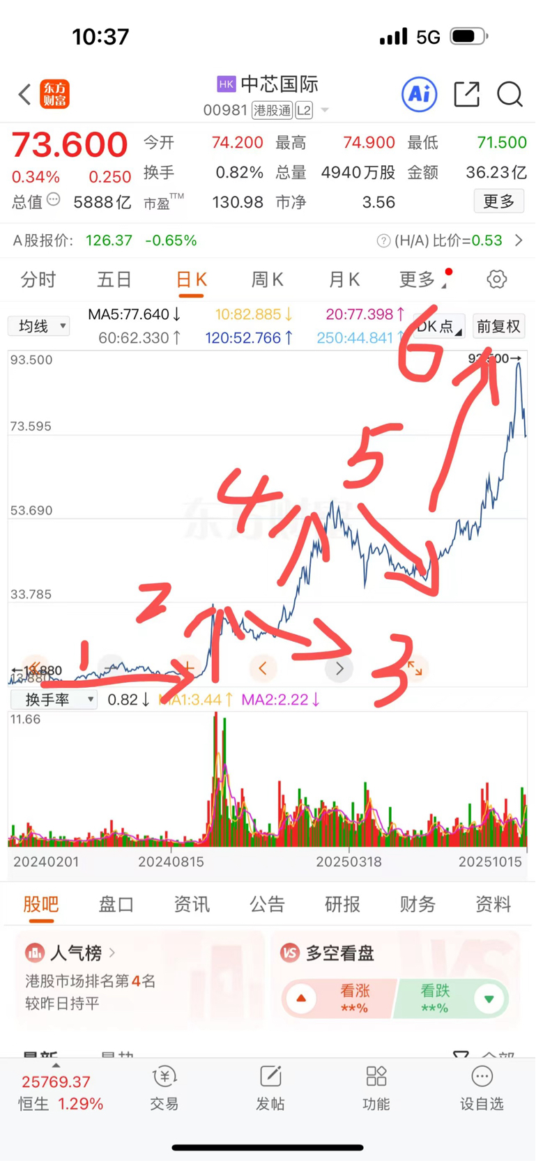 $中芯国际(HK|00981)$ 1的盘整→ 2的上攻→ 3的洗盘→ 4的上攻→ 5的洗盘→ 6的猛冲→ 7再洗→ 8怎么走?大家猜!懂得都懂,且持筹码且珍惜!