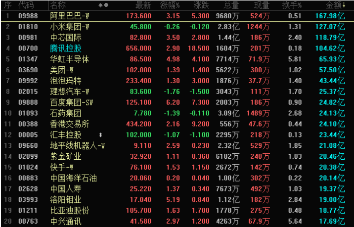 盘面上,大型科技股普遍上涨助力大市走俏;半导体股芯片股涨幅居前,龙头中芯国际盘中一度涨超5%;加密货币短线拉升,比特币短线涨幅一度扩大至约2000美元,加密货币概念股集体上涨,核电股全天表现活跃,手游股、纸业股、苹果概念股、濠赌股、海运股纷纷上涨。另一方面,中资券商股午后持续走弱,餐饮股、内房股、乳制品股、家电股部分走弱。