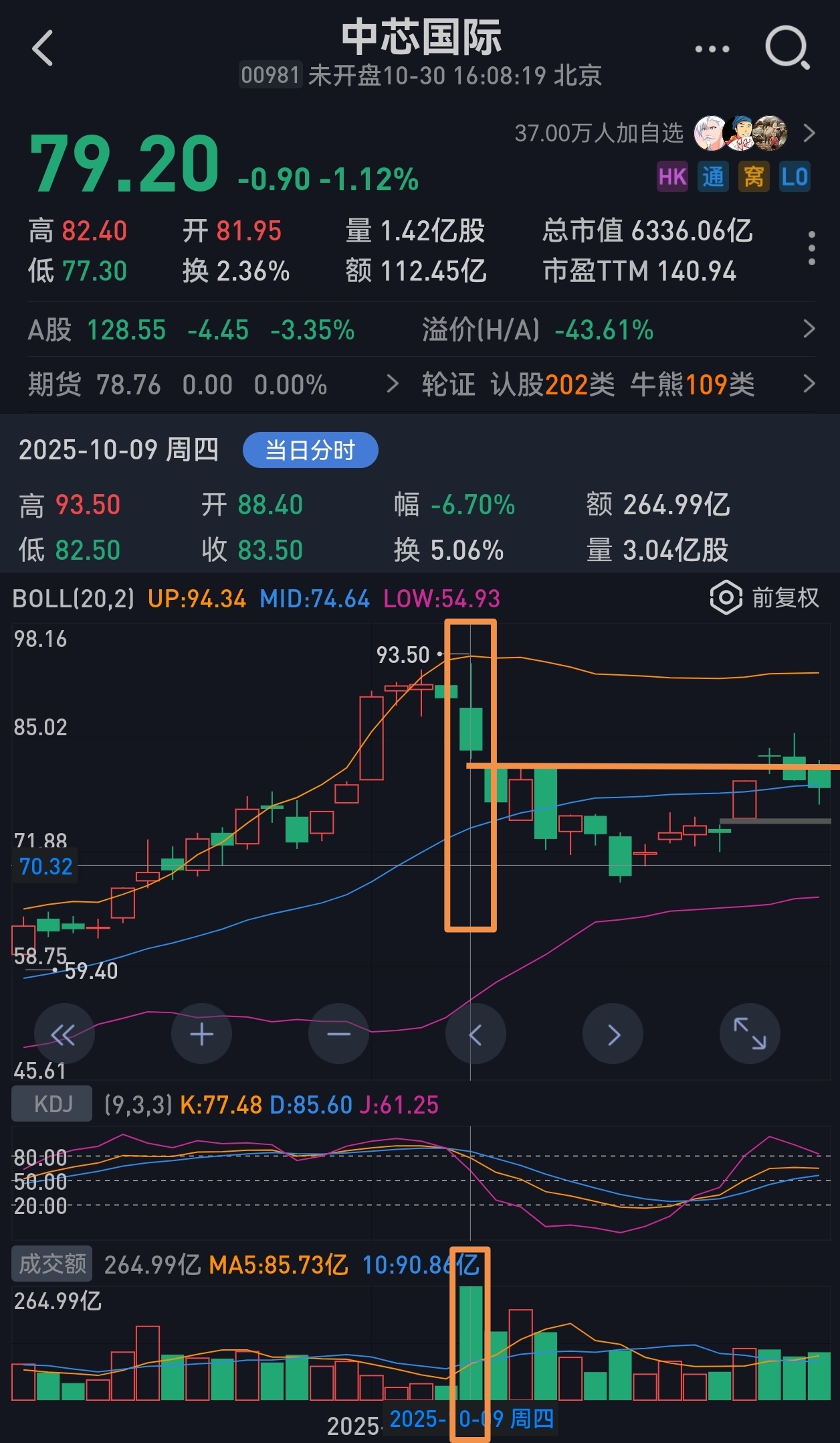 $中芯国际(HK|00981)$ 反弹连续两天都无法有效突破这根放量K线的下沿,再而衰三而竭,昨天还跌破boll中轨,如果今天还无果可能又得向下寻找支撑了