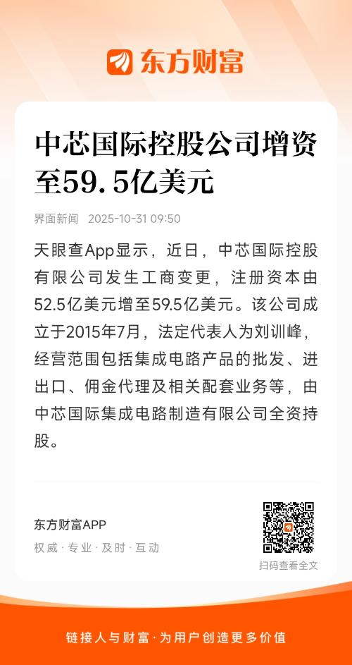 天眼查App显示,近日,中芯国际控股有限公司发生工商变更,注册资本由52.5亿美元增至59.5亿美元。该公司成立于2015年7月,法定代表人为刘训峰,经营范围包括集成电路产品的批发、进出口、佣金代理及相关配套业务等,由中芯国际集成电路制造有限公司全资持股。